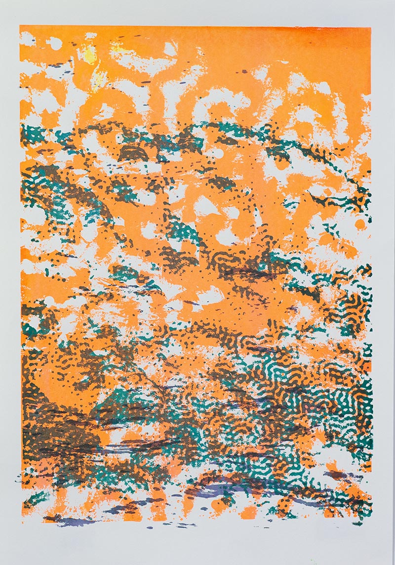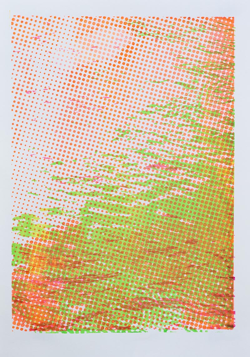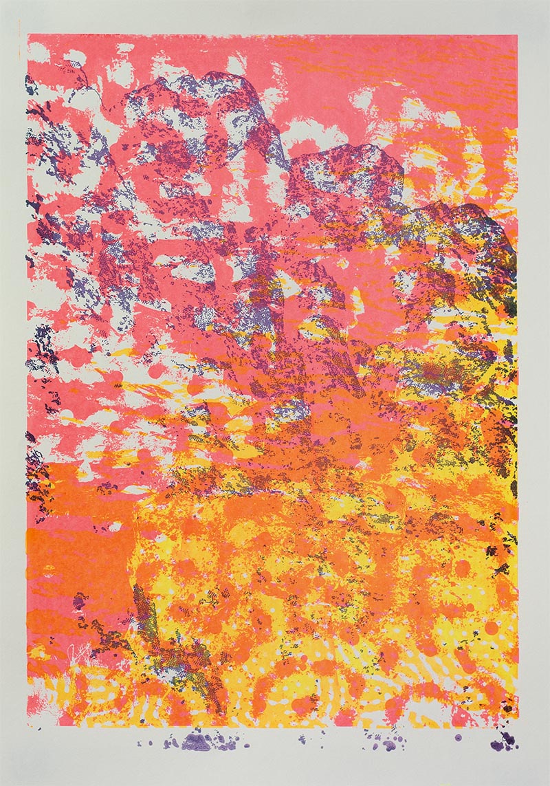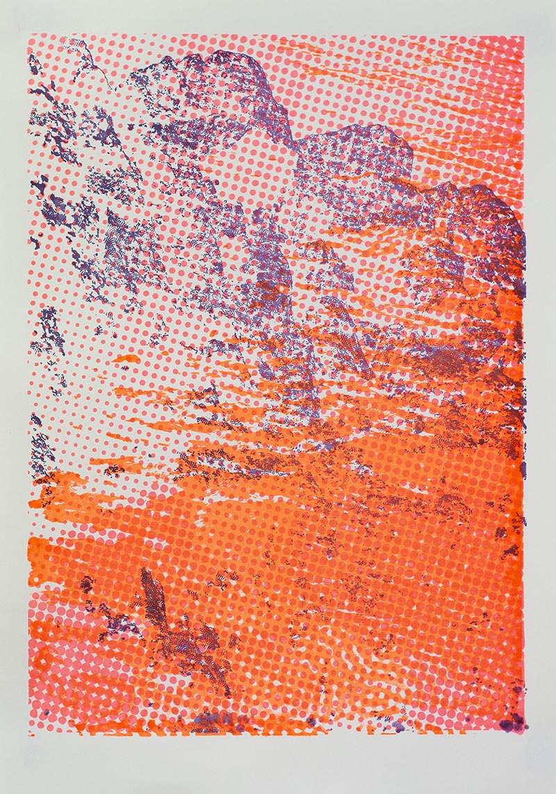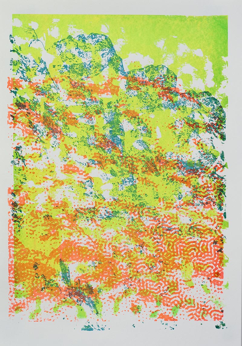 Þriggja lita silkiprent verk prentuð með flurocent lit á 170 gr Munken pappír.