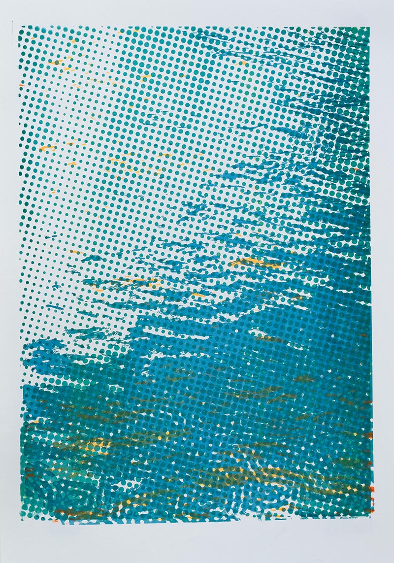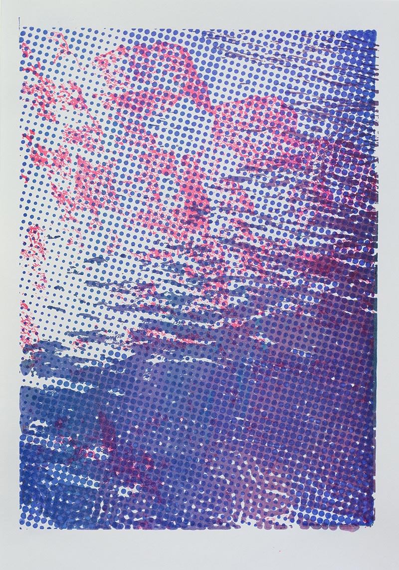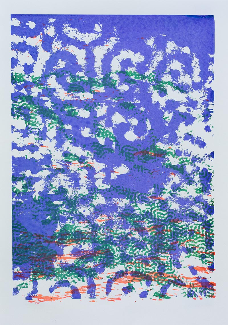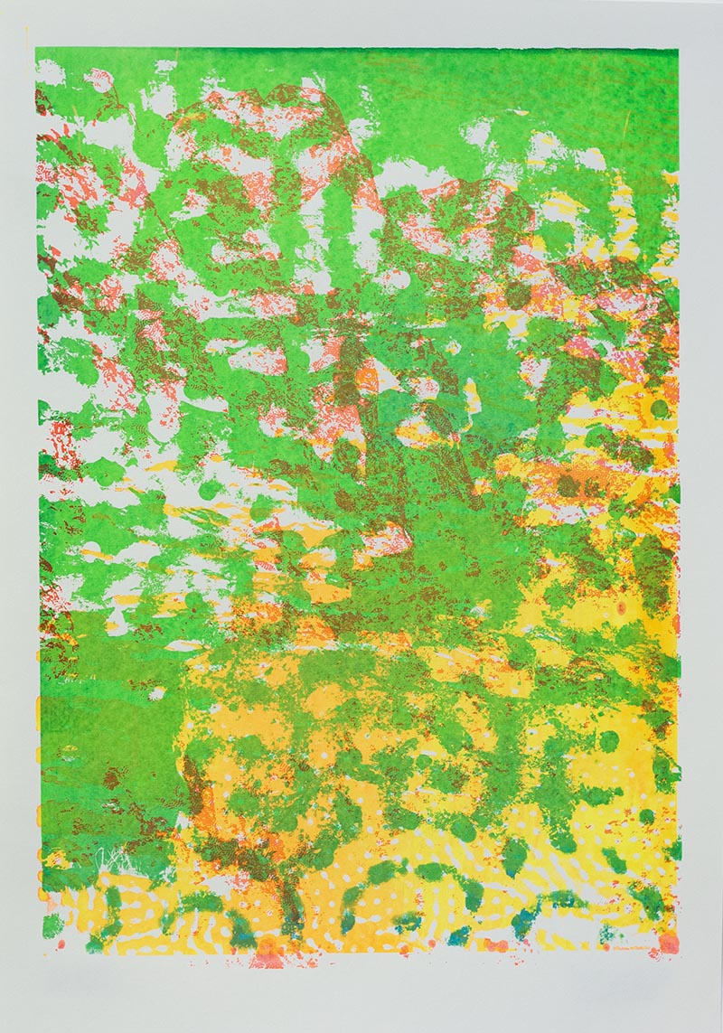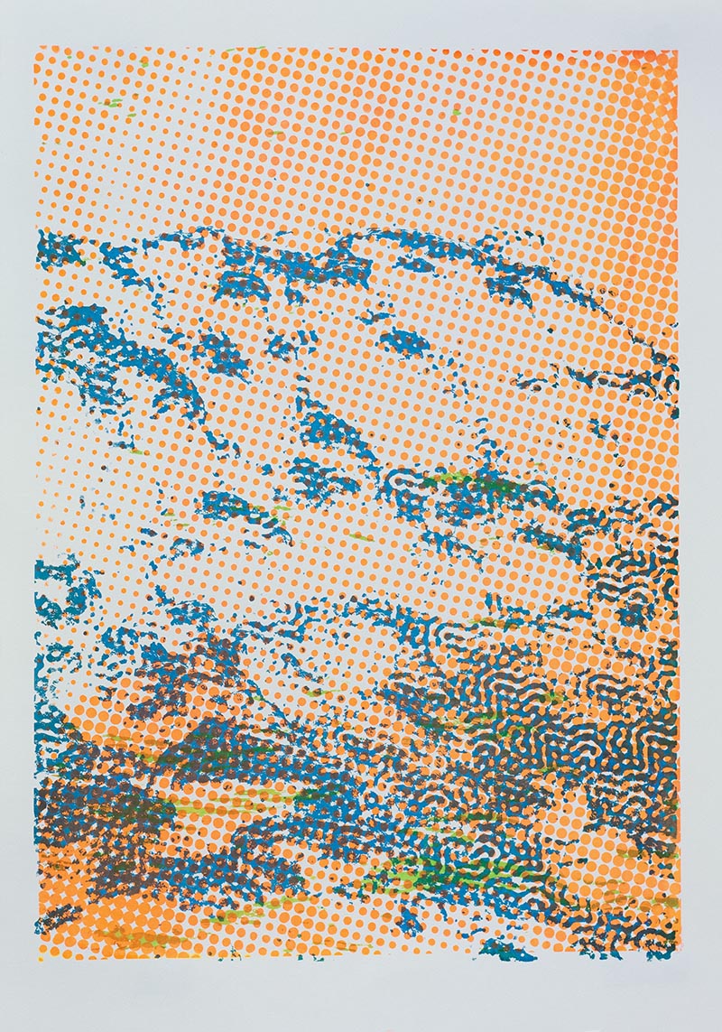 Þriggja lita silkiprent verk prentuð með flurocent lit á 170 gr Munken pappír.