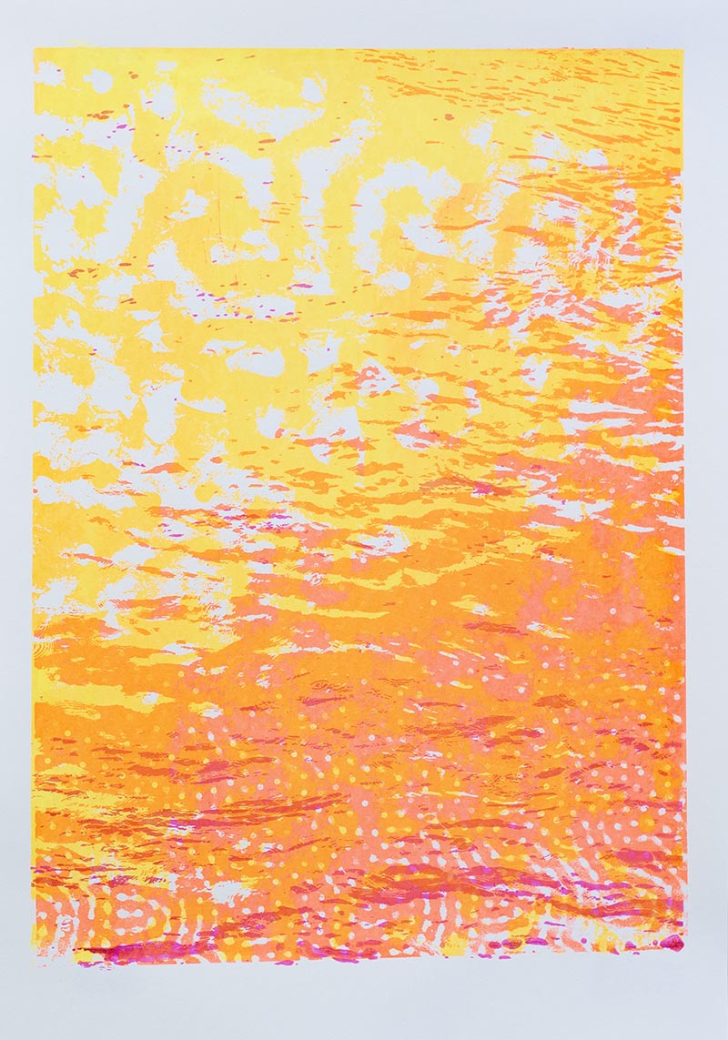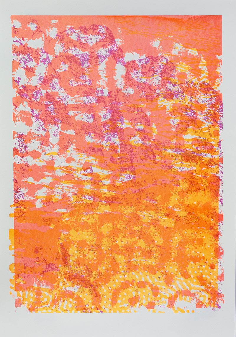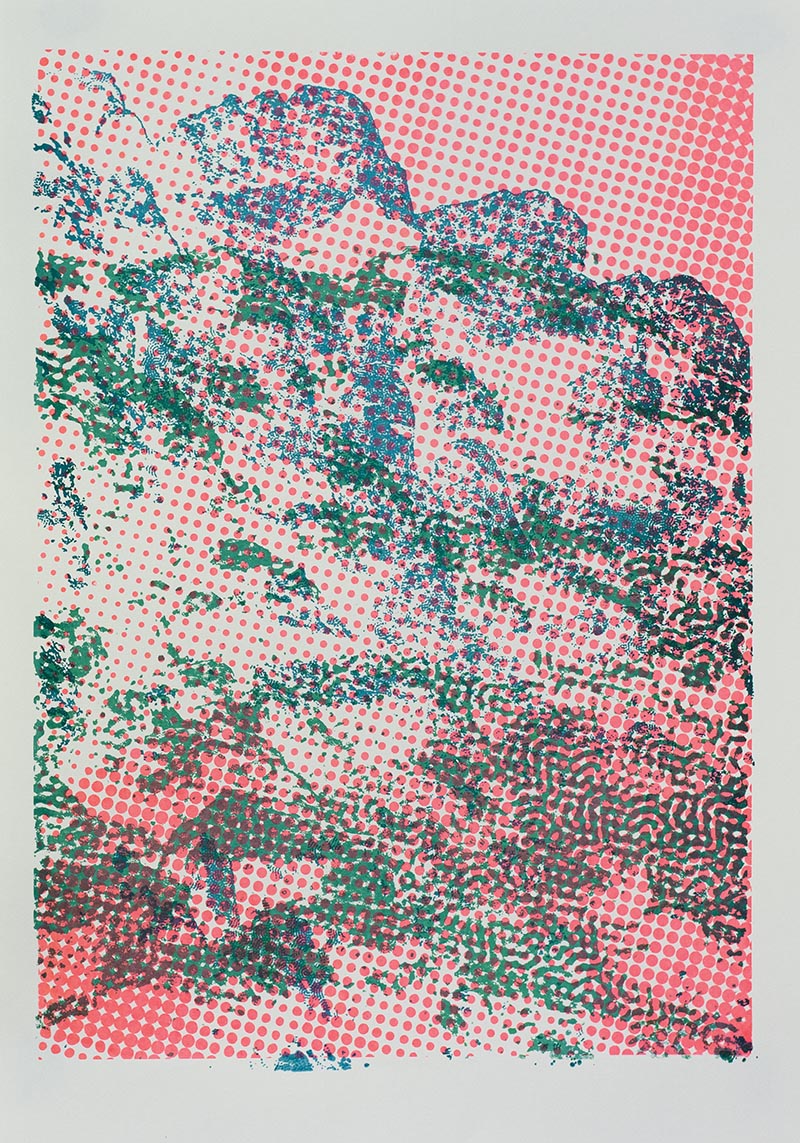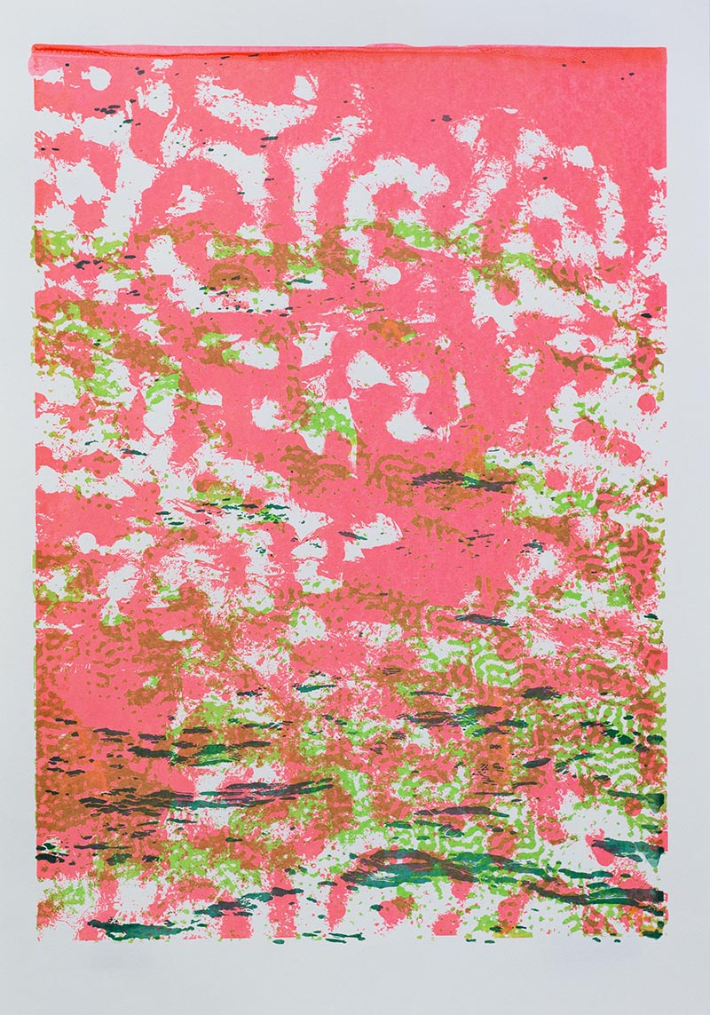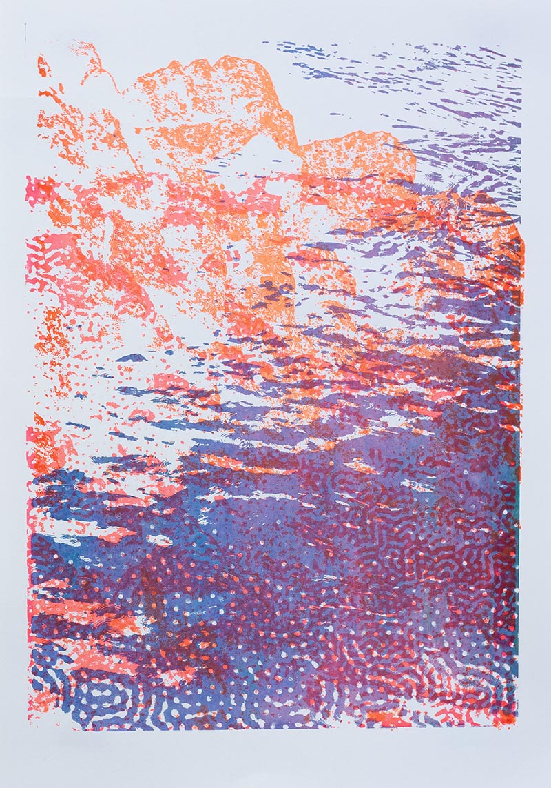 Þriggja lita silkiprent verk prentuð með flurocent lit á 170 gr Munken pappír.