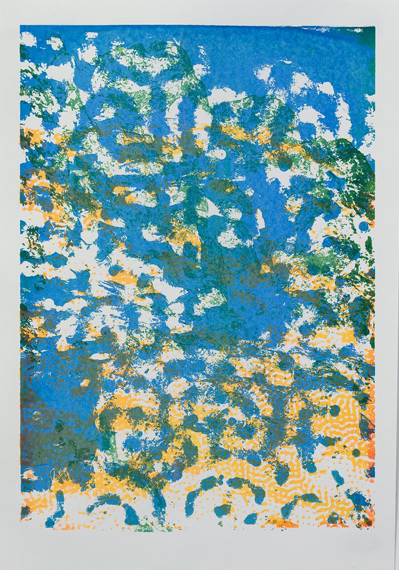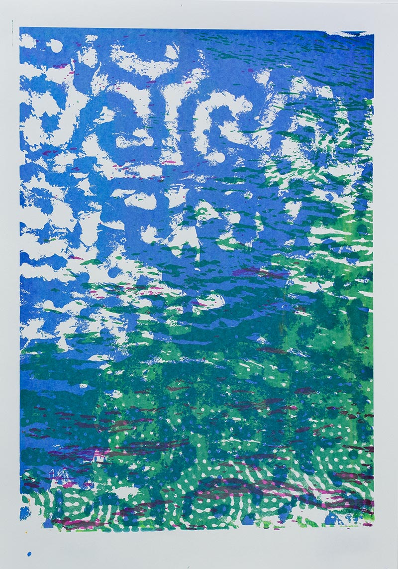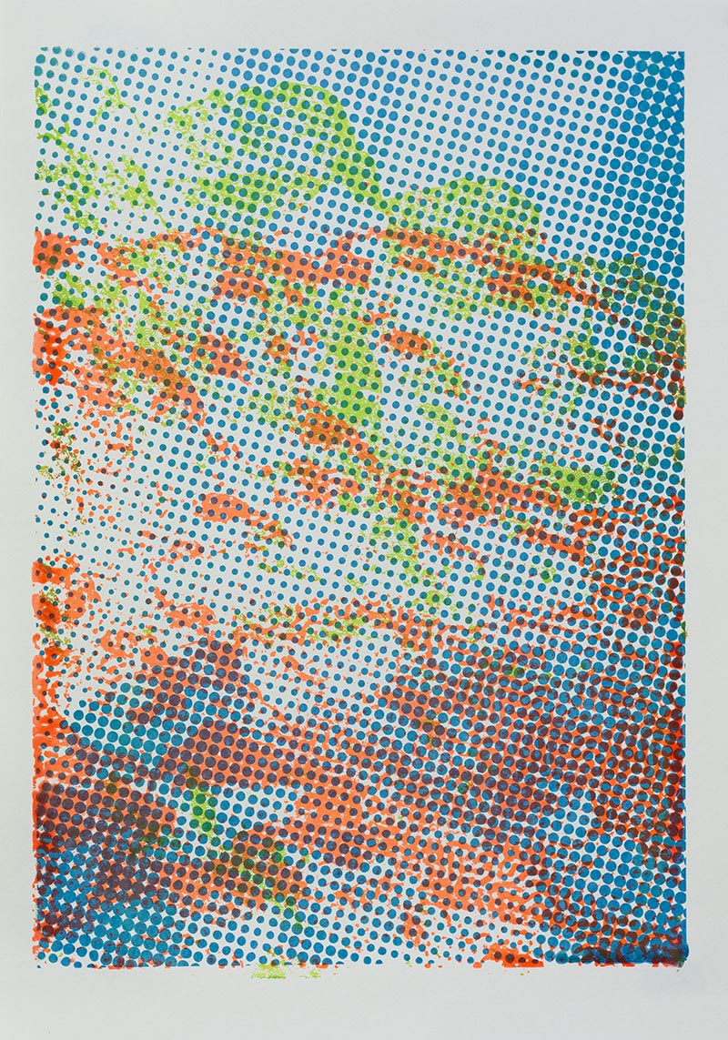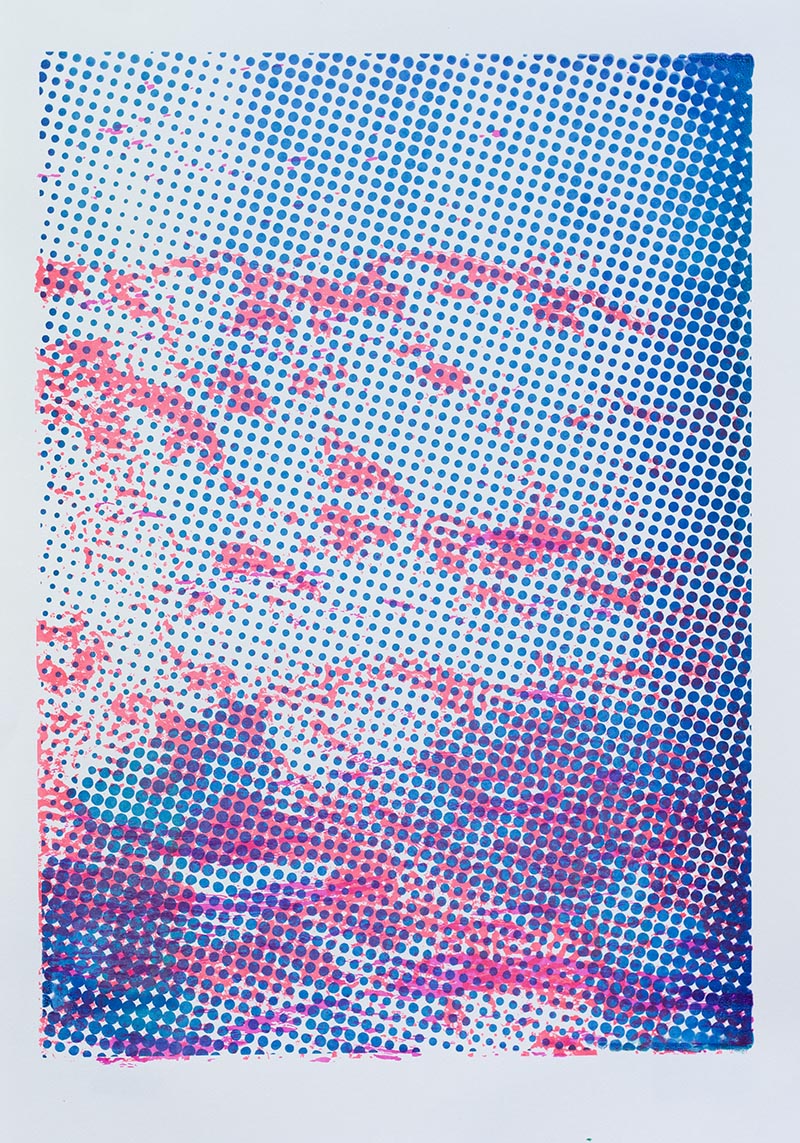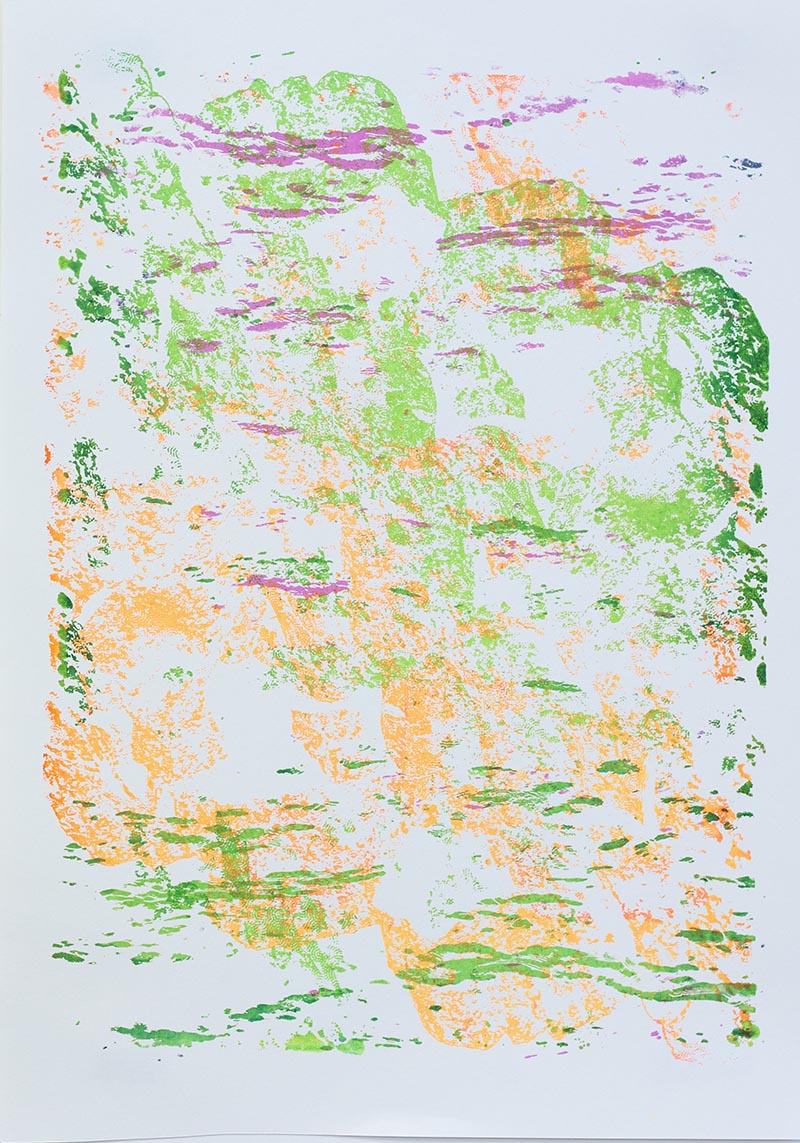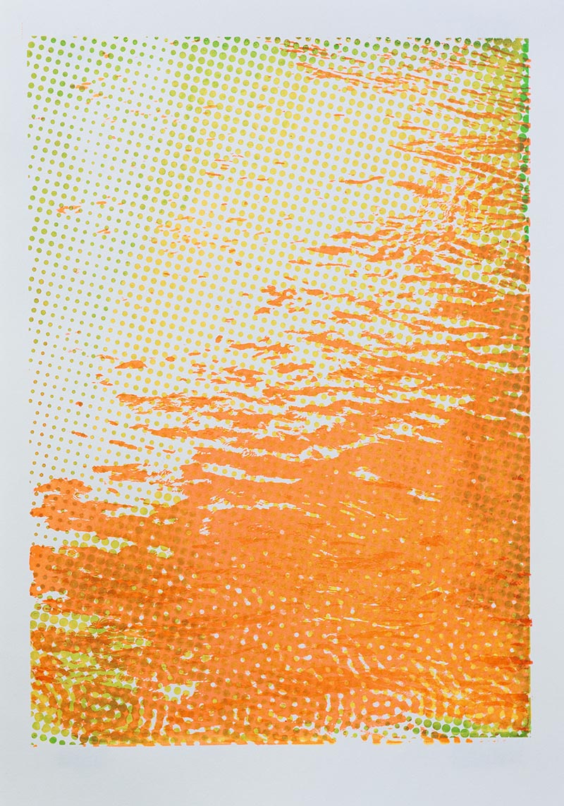Þriggja lita silkiprent verk prentuð með flurocent lit á 170 gr Munken pappír.